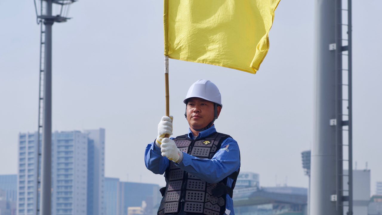 タイム測定線の延長線上に立ち、競走が開始したことを決勝審判委員に知らせる業務。この黄旗の合図により、レースタイムの計測が行われています。